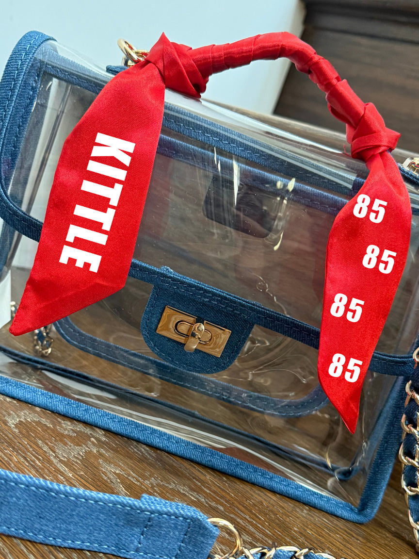 Red crossbody bag made of clear stadium-compliant pvc for game day.Clear, stadium approved bag with black straps, sunglasses, and lip products on a wooden surface